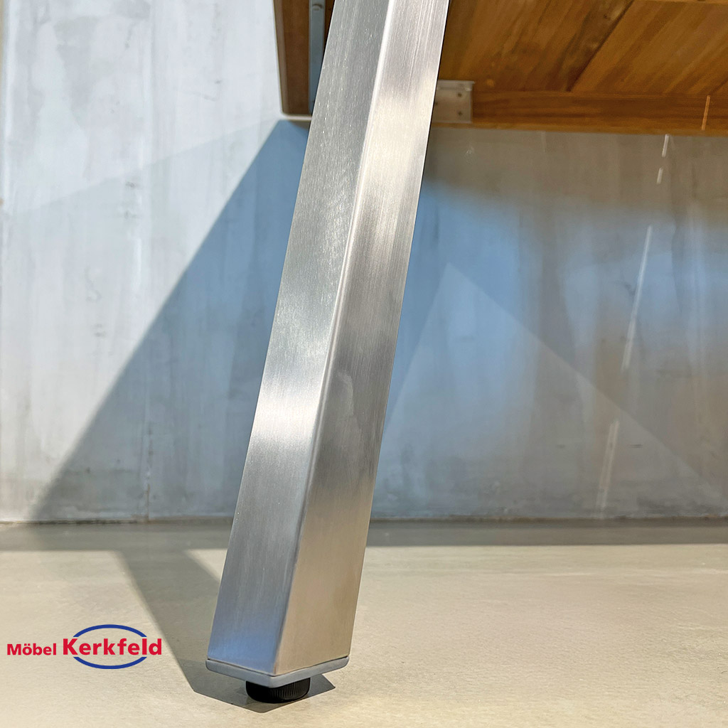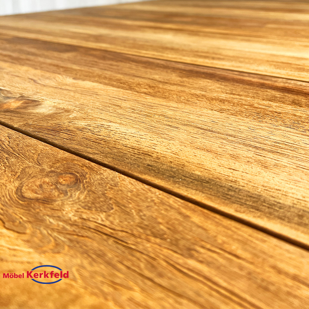 | Tischplatte | Recyceltes Teakholz mit Schweizer Kante (angeschrägt) |