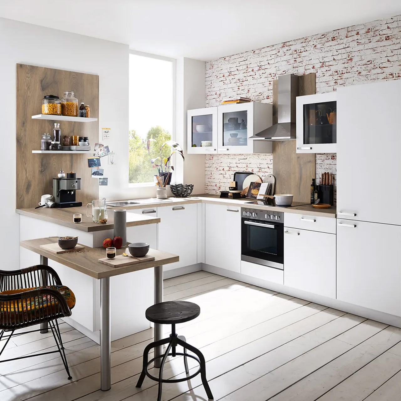 Eine wohnliche Kombination in klassischem Weiß und Castell Eiche: Diese Manhattan Uni lädt mit dem integrierten Essplatz zum Verweilen ein.
