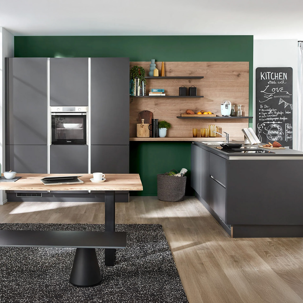 Kompakt und funktional: Die Echtlackküche SOFT LACK in Graphit bestich vor allem durch die Planung als grifflose Variante MatrixArt. Die integrierte Beleuchtung der Griffspuren sorgt für eine einzigartige Lichtstimmung.