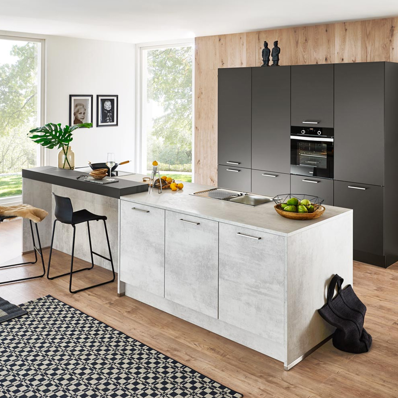 Diese großzügige Inselküche mit Fronten in STONE Beton Weiß lässt garantiert keine Wünsche offen. Durch die Kombination mit Fronten in Graphit matt mit Anti-Fingerprint-Eigenschaft wirkt sie besonders edel.