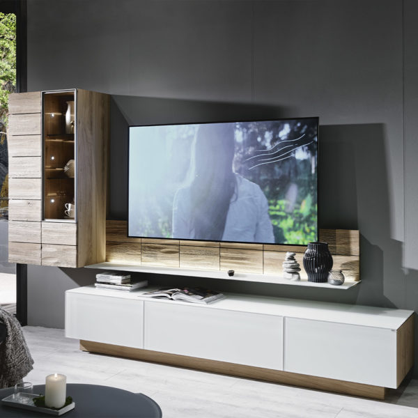 Natürlich – gesund – sinnlich, dafür steht diese Voglauer Wohnwand Vorschlag 136. Seine natürliche Holzoptik sorgt für eine wohnliche Atmosphäre und bringt durch die weißen Glasfronten zeitloses Design in Ihr Wohnzimmer. Einstellbare LED Spots (dimmbar bei Funkschaltung) in Vitrinen und Highboards sorgen für ein attraktives Erscheinungsbild. Diese Wohnwand ist ein absoluter Hingucker!